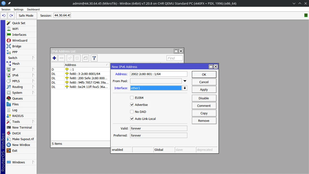 At this point, devices connected to the interface you added the IPv6 address to (in my case ether1)