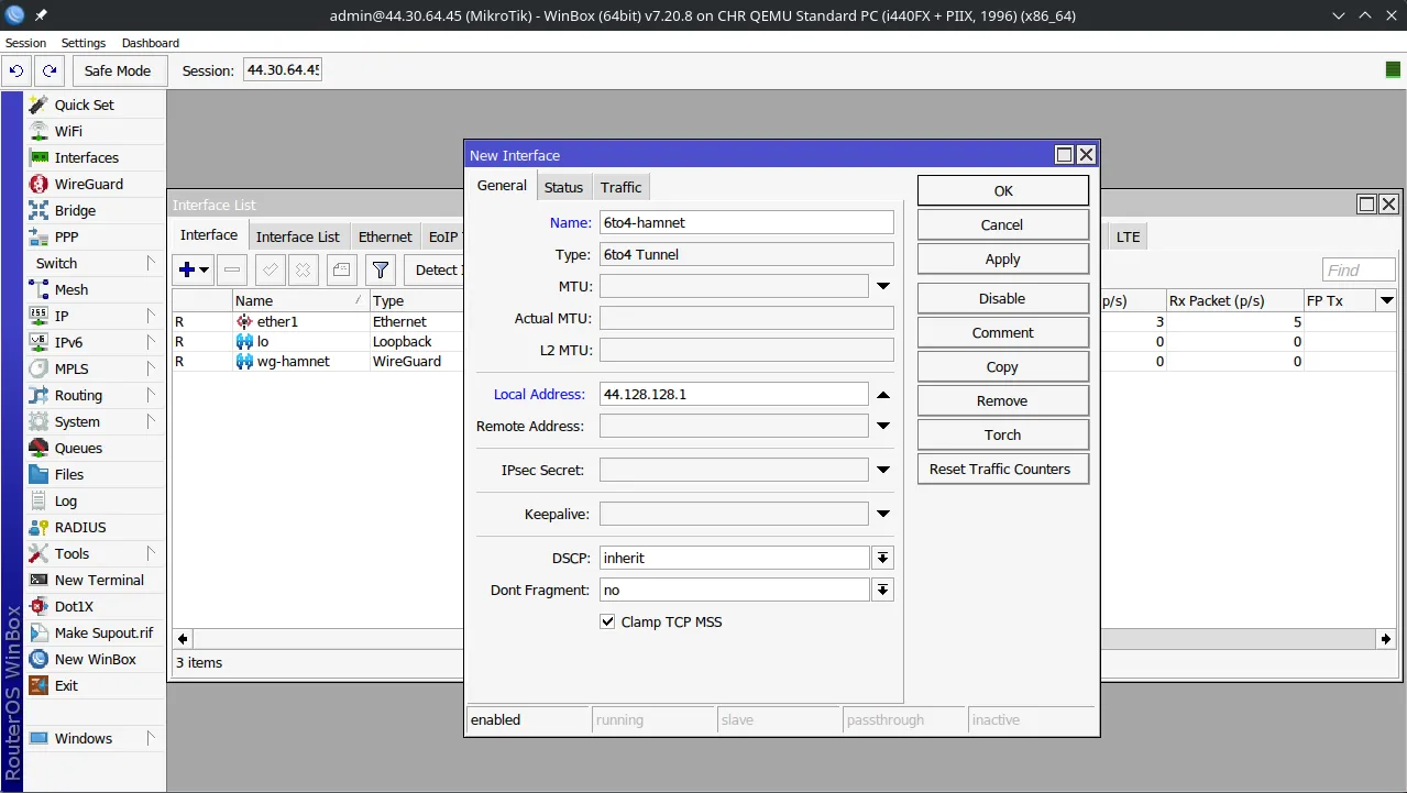 6to4 tunnelinterface with theLocal Addressset to the HAMNET address of your router. Leave theRemote addressempty or set to0.0.0.0.