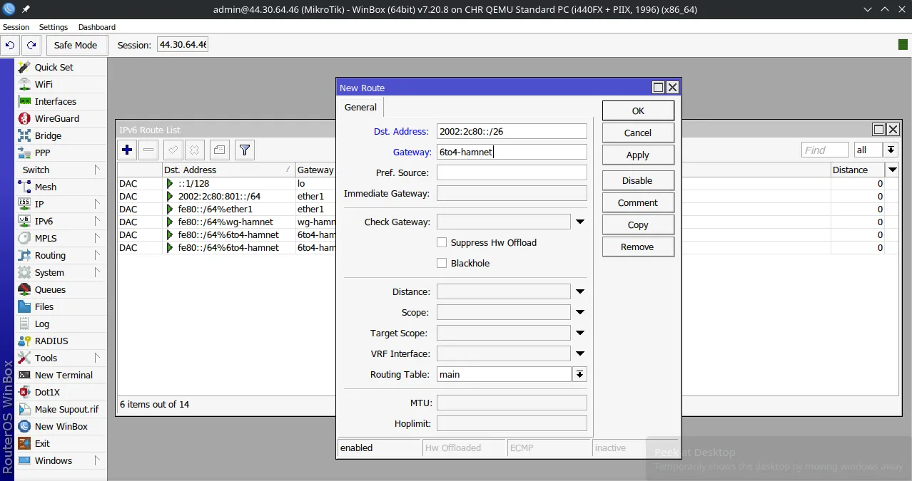 IPv6 > Routesand add a route for HAMNET.Destination Addressshould be2002:2c80::/26which maps to 44.128.0.0/10.Gatewayshould be the name of your 6to4 interface.